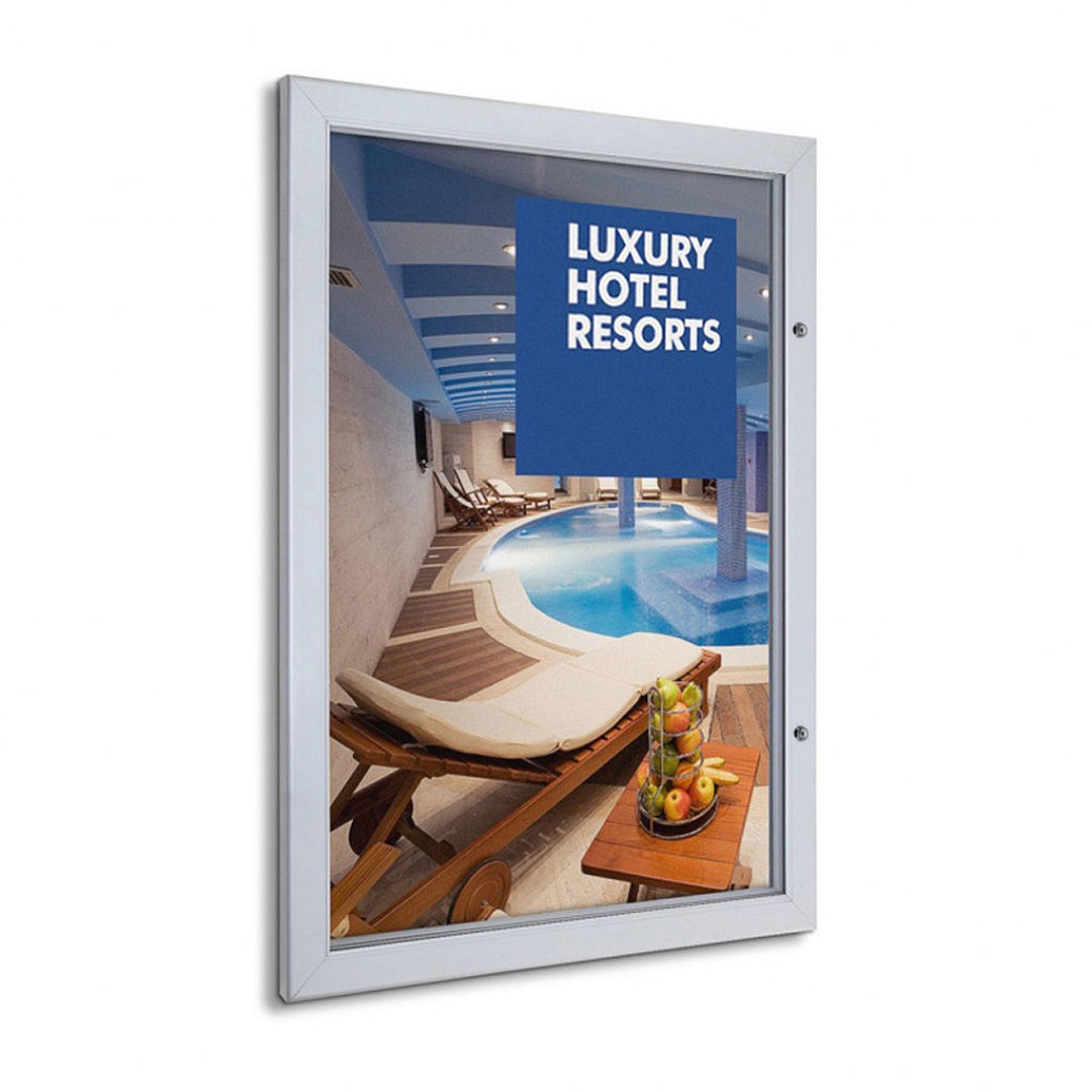 La bacheca a libro porta poster per ambienti chiusi è dotata di una speciale clip interna per appendere il poster all’interno nella bacheca. La struttura è realizzata in alluminio anodizzato silver. Il fondo della bacheca è in plastica. L’anta trasparente in policarbonato resistente si apre a libro e a seconda delle dimensioni ha una o due serrature.Il materiale per fissaggio a muro lo trovi incluso. F.to A3