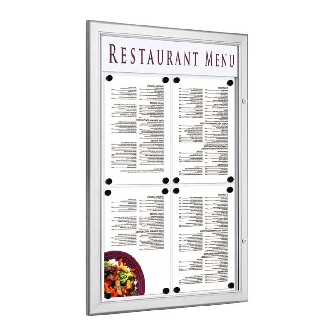 Anta in policarbonato trasparente con apertura a libro e serratura e chiavi in dotazione.Pannello di intestazione personalizzabile con logo o rimovibile,fondo in metallo magnetico e scrivibile. F.to 4xA4