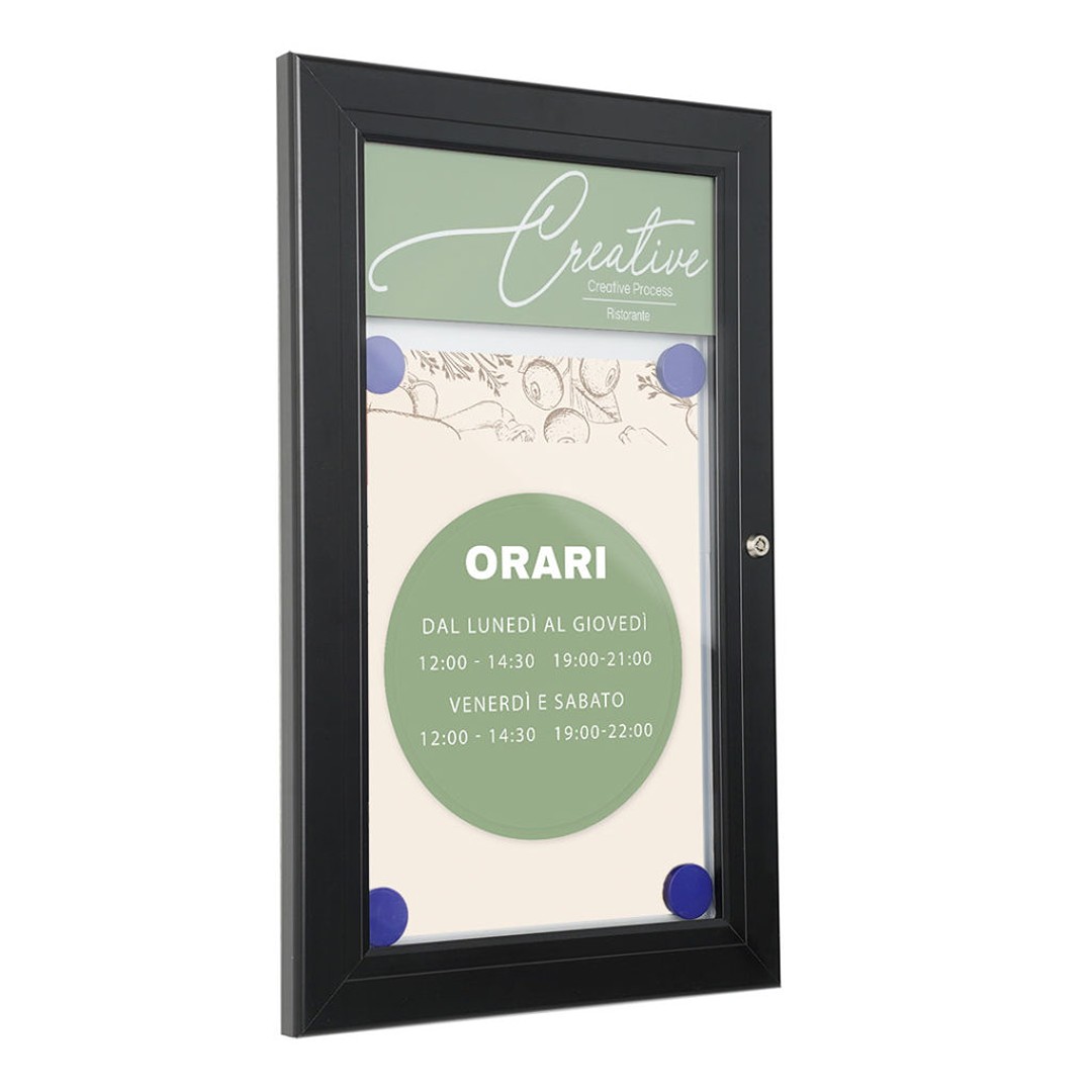 Anta in policarbonato trasparente con apertura a libro e serratura e chiavi in dotazione.Pannello di intestazione personalizzabile con logo o rimovibile,fondo in metallo magnetico e scrivibile. F.to 4xA4