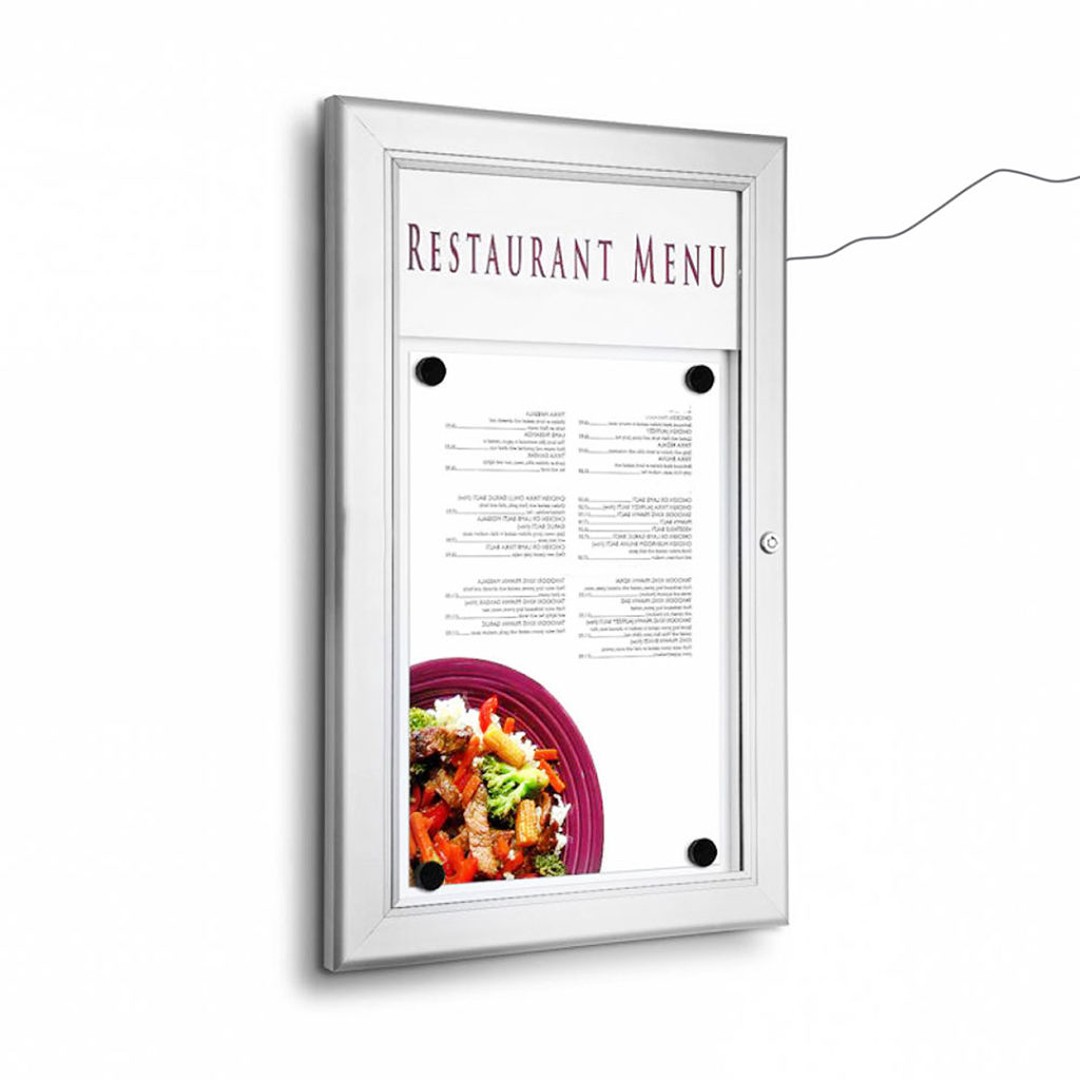 Anta in policarbonato trasparente con apertura a libro e serratura e chiavi in dotazione.Pannello di intestazione personalizzabile con logo o rimovibile,fondo in metallo magnetico e scrivibile. Bacheca dotata di LED F.to A4