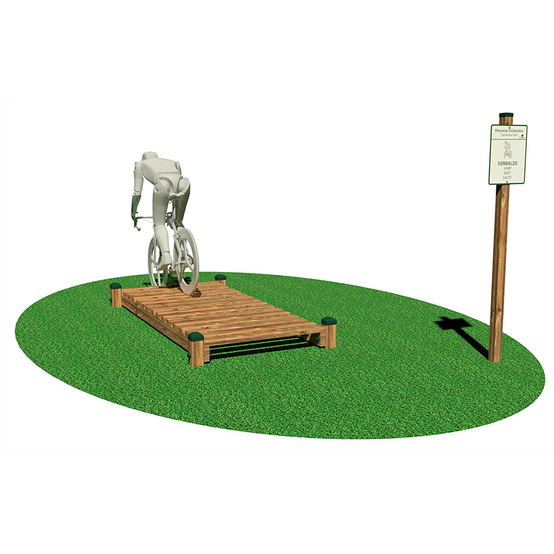 Realizzata in legno di pino nordico impregnato in autoclave con sali atossici. Composta da n°1 pedana dim. cm 120 x 250 realizzata con tavole della sez. di cm 9 x 3,5, fissata al terreno mediante montanti in legno lamellare della sezione cm 9x9. La stazione è munita di cartello in alluminio Dibond® spess. mm 3 dim. cm 33x41 sul quale vi è serigrafato un’immagine rappresentativa, ed il nome della stazione in diverse lingue; il cartello è sorretto da un palo in legno lamellare della sez. cm 7 x 7 ed altezza cm 250 da interrare. Assemblaggio mediante bulloneria in acciaio zincato 8.8 e dadi autobloccanti. Elementi copridado a norma in nylon colorato. Tappi copripalo in polietilene. Conforme alla Norma Europea EN 1176. Dimensione cm 235x119x22h