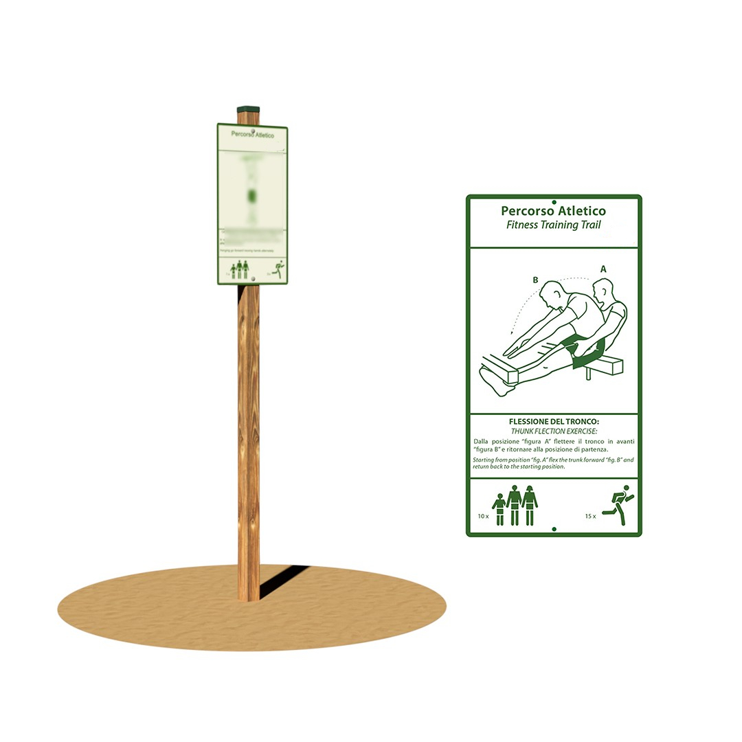La stazione è munita di cartello cm 62×33 in alluminio Dibond® spess. mm 3 sul quale vi è serigrafato, l’esercizio, con relativa descrizione, e il numero di ripetizioni; il cartello è sorretto da un palo in legno lamellare della sez. cm 7 x 7 ed altezza cm 250 da interrare.