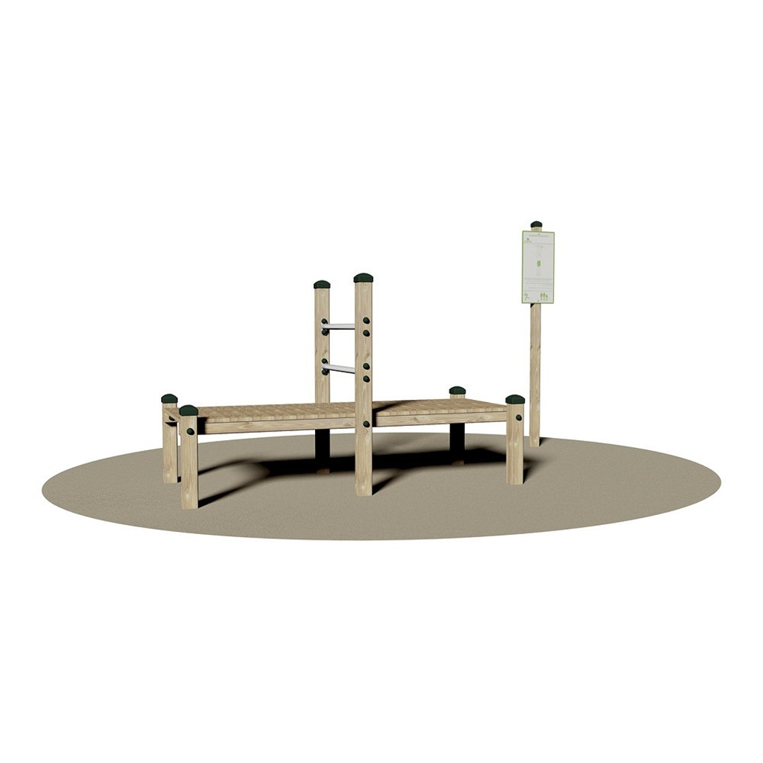 STAZIONE CON ATTREZZO. Realizzato in legno lamellare di pino nordico impregnato in autoclave con sali atossici. Costituita da n° 6 montanti della sez. cm 9 x 9, assemblati a n° 1 pedana in legno realizzata con tavole della sez. cm 14 x 2,5 e n° 2 barre orizzontali realizzate con tubo tondo di acciaio zincato a caldo della sez. Ø 4 cm. La stazione è munita di cartello (opzionale) cm 62x33 in alluminio Dibond® spess. mm 3 sul quale vi è serigrafato l’esercizio, con relativa descrizione, e il numero di ripetizioni; il cartello è sorretto da un palo in legno lamellare della sez. cm 7 x 7 ed altezza cm 250 da interrare. Assemblaggio mediante bulloneria in acciaio zincato 8.8 e dadi autobloccanti. Elementi copridado a norma in nylon colorato. Tappi copripalo in polietilene. Conforme alla Norma Europea EN 1176. Ingombro max: cm 230x100x125h