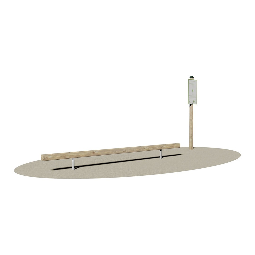 STAZIONE CON ATTREZZO Realizzata in legno lamellare di pino nordico impregnato in autoclave con sali atossici. Costituita da n° 1 trave orizzontale sez. cm 9 x 9 collegato a n° 2 supporti verticali in tubolare di acciaio zincato a caldo Ø cm 4 per il fissaggio al terreno. La stazione si può completare con il cartello (opzionale) da cm 62x33 in alluminio Dibond® spess. mm 3 sul quale vi è serigrafato l’esercizio, con relativa descrizione, e il numero di ripetizioni; il cartello è sorretto da un palo in legno lamellare della sez. cm 7 x 7 ed altezza cm 250 da interrare. Assemblaggio mediante bulloneria in acciaio zincato 8.8 e dadi autobloccanti. Elementi copridado a norma in nylon colorato. Conforme alla Norma Europea EN 1176. Ingombro max: cm 300x9x20h