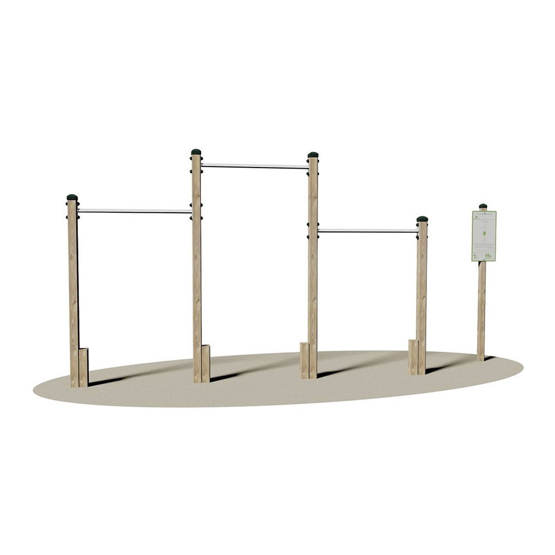 STAZIONE CON ATTREZZO Realizzato in legno lamellare di pino nordico impregnato in autoclave con sali atossici. Costituita da n° 4 montanti verticali della sez. cm 9 x 9, collegati consecutivamente, a n° 3 barre orizzontali realizzate con tubo tondo di acciaio zincato a caldo della sez. Ø 4 cm. La stazione è munita di cartello (opzionale) cm 62x33 in alluminio Dibond® spess. mm 3 sul quale vi è serigrafato, l’esercizio, con relativa descrizione, e il numero di ripetizioni; il cartello è sorretto da un palo in legno lamellare della sez. cm 7 x 7 ed altezza cm 250 da interrare. Assemblaggio mediante bulloneria in acciaio zincato 8.8 e dadi autobloccanti. Elementi copridado a norma in nylon colorato. Tappi copripalo in polietilene.. Conforme alla Norma Europea EN 1176. Ingombro max: cm 396x9x240h