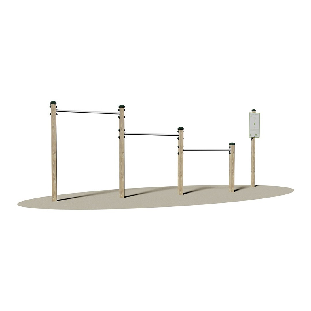 Realizzato in legno lamellare di pino nordico impregnato in autoclave con sali atossici. Costituita da n° 4 montanti verticali della sez. cm 9 x 9, collegati consecutivamente, a n° 3 barre orizzontali realizzate con tubo tondo di acciaio zincato a caldo della sez. Ø 4 cm. La stazione è munita di cartello (opzionale) cm 62x33 in alluminio Dibond® spess. mm 3 sul quale vi è serigrafato l’esercizio, con relativa descrizione, e il numero di ripetizioni; il cartello è sorretto da un palo in legno lamellare della sez. cm 7 x 7 ed altezza cm 250 da interrare. Assemblaggio mediante bulloneria in acciaio zincato 8.8 e dadi autobloccanti. Elementi copridado a norma in nylon colorato. Tappi copripalo in polietilene. Conforme alla Norma Europea EN 1176. Ingombro max: cm cm 396x9x180h