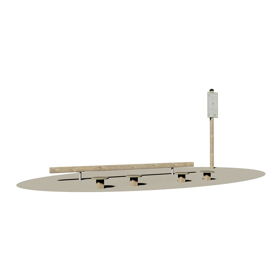 Realizzato in legno lamellare di pino nordico impregnato in autoclave con sali atossici. Costituita da n° 1 trave orizzontale sez. cm 9 x 9 collegata a n° 2 supporti verticali in tubolare di acciaio zincato a caldo Ø cm 4 per il fissaggio al terreno e n° 4 tronchetti completi di piano di appoggio per le mani, in multistrato di betulla ad incollaggio fenolico con zigrinatura antiscivolo delle dim. Ø 32 cm.