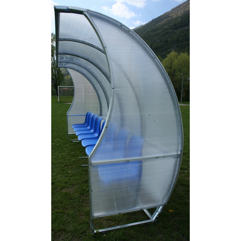 Panchina per allenatori/riserve gioco calcio, lunghezza m. 4. Struttura in tubolare d'acciaio zincato a caldo sezione mm 30x30. Panca da bordo campo modulare e componibile, ampliabile in ogni momento, copertura in policarbonato alveolare mm 6 e protezione anti UV, tamponamento inferiore con pannelli in resina melaminica spessore mm 4, fissaggio a terra tramite appositi profili ad Omega in acciaio zincato, telaio di seduta in tubolare d'acciaio zincato sezione mm 50x30 e lamiera spessore 30/10 per il fissaggio delle seggiole in PVC. Bulloneria di assemblaggio 8.8. Ingombro totale cm. 400 x 120 x 200 h. Completa di n.8 sedute in plastica.