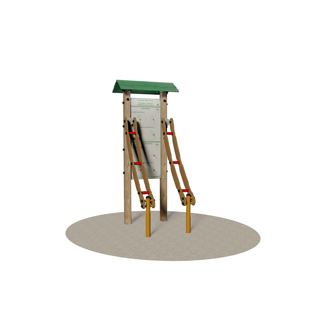 Entrambe le strutture sono collegate a n° 2 montanti verticali in legno lamellare aventi la sez. di cm 9×9 a sostegno di un telaio in acciaio zincato e verniciato sul quale è assemblato il cartello illustrativo, dim. cm 59,5x123h in Dibond® spess. mm 3, riportante l’esercizio con relativa descrizione, e il numero di ripetizioni.