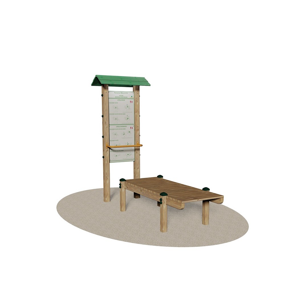 La stazione è munita di una struttura composta da montanti in legno della sez. di cm 9×9 e telaio in acciaio zincato e verniciato sul quale è posizionato il cartello illustrativo, dim. cm 59,5x123h in Dibond® spess. mm 3, riportante l’esercizio con relativa descrizione, e il numero di ripetizioni. A completamento della stazione un tetto decorativo in perlinato.