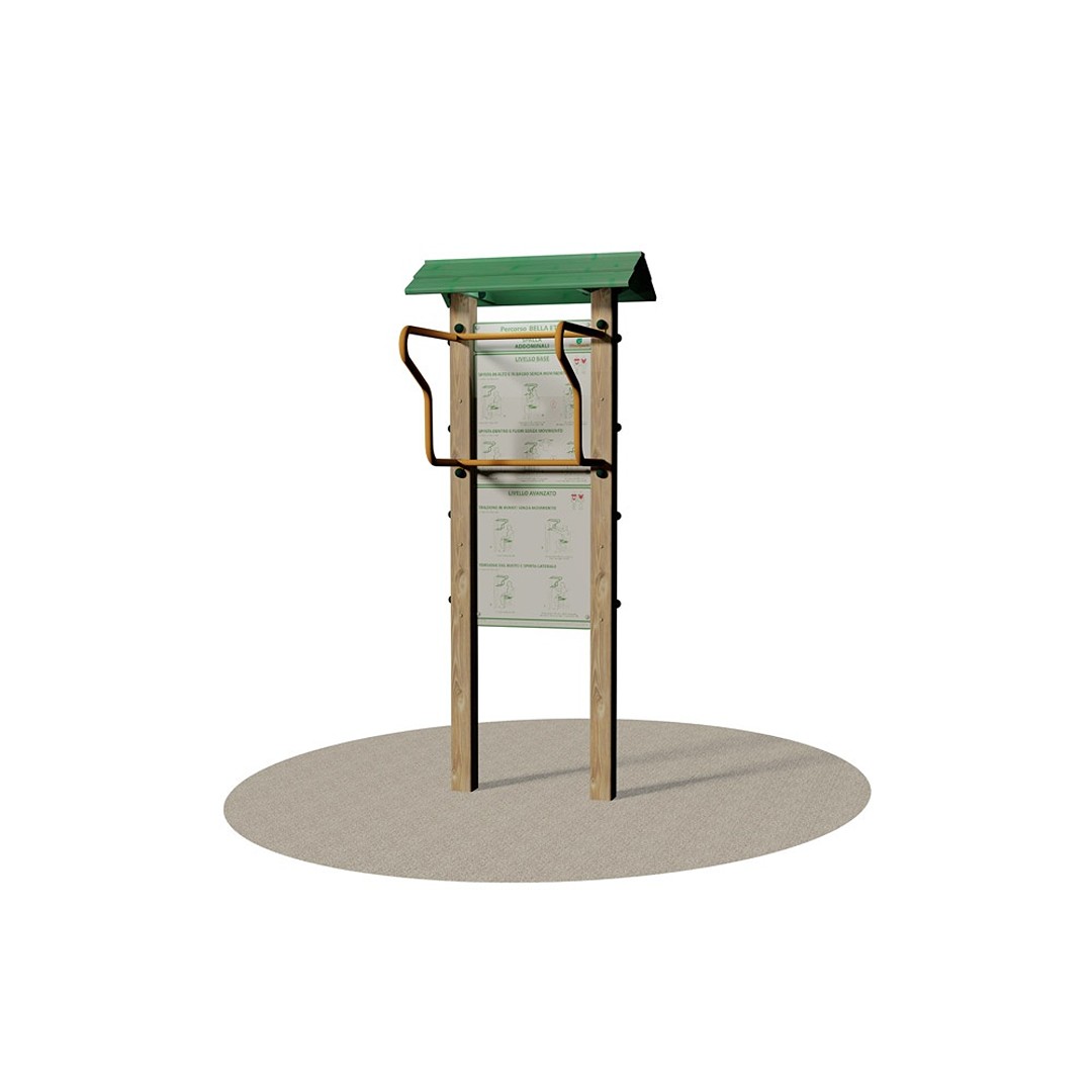 ATTREZZO SOFT FITNESS realizzato in legno lamellare di pino nordico impregnato in autoclave con sali atossici. Costituita da n° 2 montanti verticali aventi la sez. di cm 9x9, collegati tra loro, da una struttura in acciaio zincato e verniciato in forno a 180°, sez. Ø 4 cm, avente la funzione di supporto all’attività motoria, e da un telaio in acciaio zincato e verniciato sul quale è assemblato il cartello illustrativo, dim. cm 59,5x123h in Dibond® spess. mm 3, riportante l’esercizio con relativa descrizione, e il numero di ripetizioni. A completamento della stazione un tetto decorativo in perlinato. Assemblaggio mediante bulloneria in acciaio zincato 8.8 e dadi autobloccanti. Elementi copridado a norma in nylon colorato. Conforme alla Norma Europea EN 1176. Dimensione cm 90x90x215h