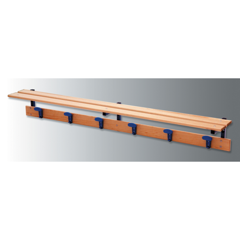 Attaccapanni parete a 6 posti con sovrastante piano borse. Struttura in tubolare d'acciaio sez. mm. 30 x 30, lunghezza m. 2, con grucce in PVC colorato.