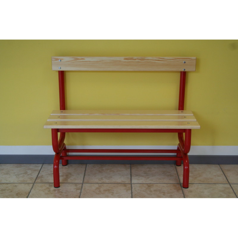 Panca per spogliatoio composta da seduta e schienale. Lunghezza m. 1.00, struttura portante in tubolare d'acciaio diam. mm. 40, antinfortunistica. Seduta e schienale in doghe di pino arrotondate e verniciate al naturale, sezione mm. 100 x 20,con 3 grucce in PVC stampato.