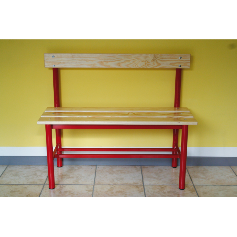 Panca per spogliatoio composta da seduta con schienale e ripiano porta scarpe sul fondo. Lunghezza m. 1,00. Struttura portante in tubolare d'acciaio diam. mm. 40. Antinfortunistica dotata di ripiano portascarpe in tubolare d'acciaio sezione mm. 20 x 20, doghe di pino arrotondate e verniciate al naturale, sezione mm. 100 x 20, con 3 grucce in PVC stampato. Completa di appoggi a terra in gomma antiscivolo.