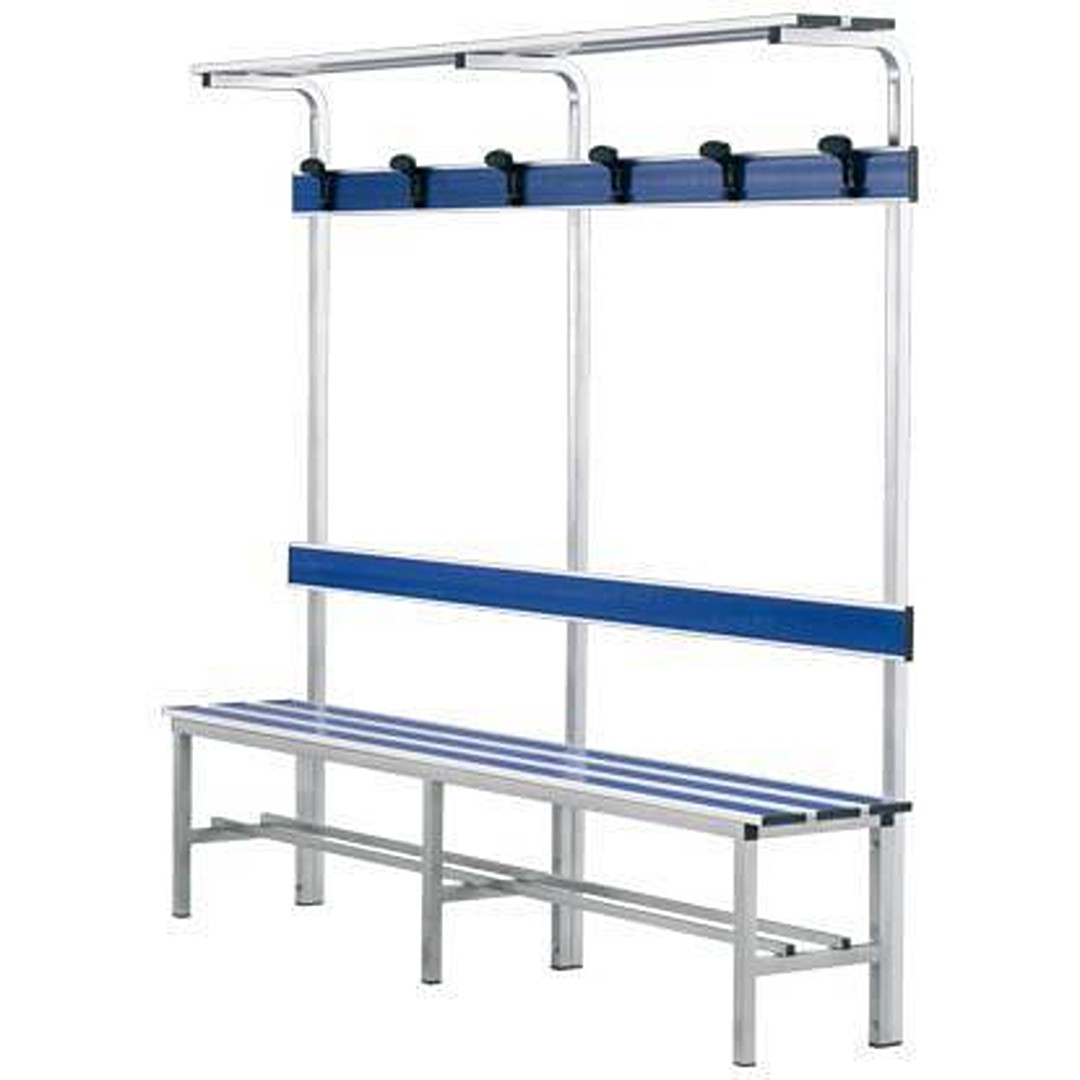Panca spogliatoio con seduta, schienale, appendiabiti e piano appoggia borse, lunghezza 2 metri, struttura in alluminio verniciato sezione 30x30 mm.. Dotata di ripiano portascarpe, seduta a tre doghe in alluminio anodizzato con inserto in pvc, punti di appoggio antiscivolo, tappi di chiusura sui terminali dei tubi. Appendiabiti con 6 grucce.