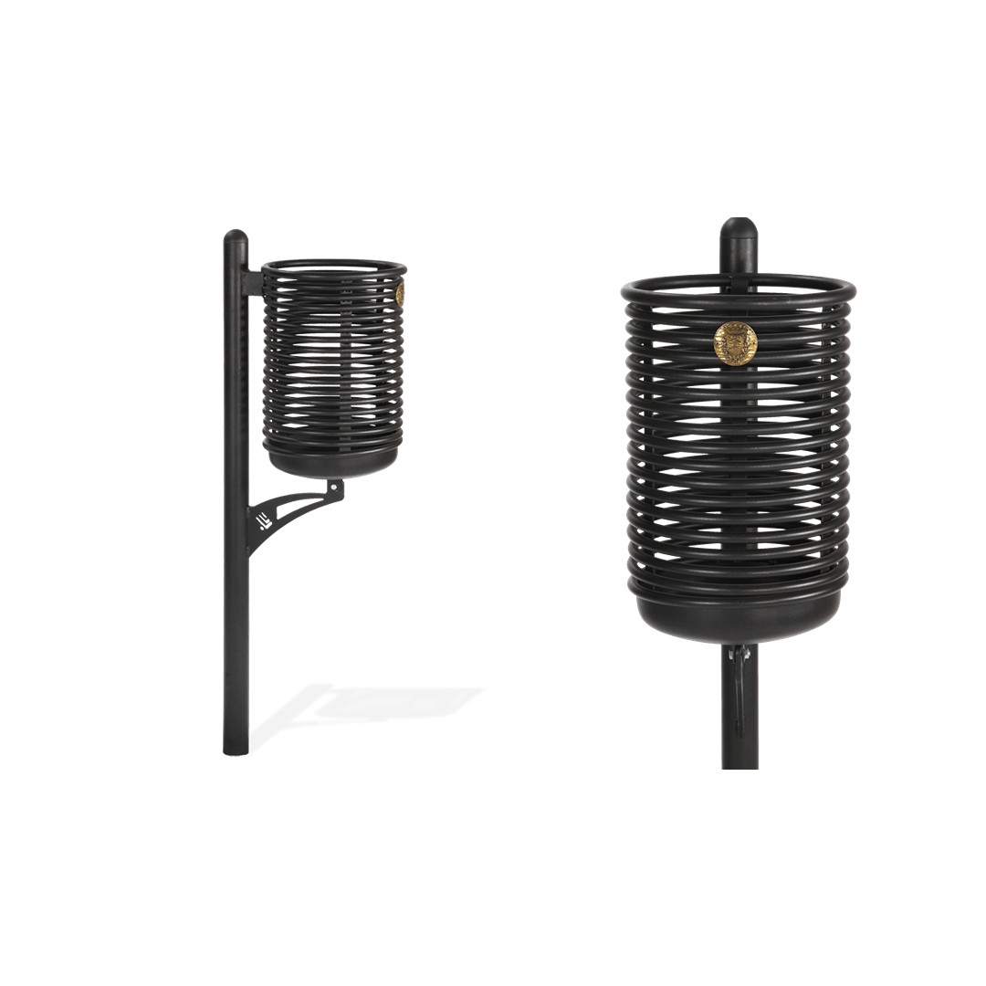 Pattumiera per la raccolta dei rifiuti indifferenziati. Struttura composta da un montante di sostegno in tubo tondo di acciaio zincato completo di tappo terminale in PVC a testa sferica e braccetto sagomato per il sostegno del cesto in lamiera di acciaio zincata. Il montante è ancorato al terreno mediante il prolungamento dello stesso nel sottosuolo. Cesto di forma cilindrica realizzato con diciotto anelli in tubo tondo di acciaio zincato e fondo sagomato in lamiera di acciaio zincata con fori per lo scarico delle acque meteoriche. Il cestino è fornito in kit di assemblaggio con viteria in acciaio inox. La finitura base per le parti metalliche di questo prodotto è del colore “canna fucile”. Il cliente può comunque richiedere una finitura differente, a scelta tra i colori RAL a disposizione. Dimensioni 34 x 45 x 103 h cm - Peso 17 kg - Capacità 35 lt.
