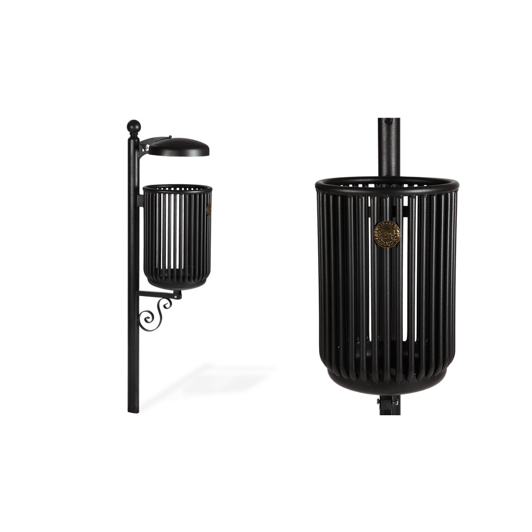 Cestino per la raccolta dei rifiuti urbani indifferenziati. Struttura composta da un montante di sostegno in tubo tondo di acciaio zincato adornato sulla parte superiore da un fregio decorativo e sulla parte inferiore da un braccetto di sostegno per il cesto e ulteriore fregio decorativo in ferro piatto zincato. Cesto di forma cilindrica realizzato con trentasette listelli in tubo tondo di acciaio zincato, parte superiore bordata da tubo tondo e parte inferiore in lamiera di acciaio zincata, sagomata e forata per lo scolo delle acque meteoriche. Le operazioni di svuotamento sono agevolate dall'utilizzo di una vite a brugola che, se rimossa, consente il ribaltamento frontale del cesto. Dotato di tettuccio. Il fissaggio al terreno avviene mediante il prolungamento del montante di sostegno nel sottosuolo. Il cestino viene fornito in kit di assemblaggio con opportuna viteria in acciaio inox. La finitura base per questo prodotto è del colore “canna fucile” caratterizzato da una cromia grigio scuro dall'effetto metallico. Il cliente può comunque richiedere una finitura differente, a scelta tra i colori RAL a disposizione. Dimensione 34 x 46 x 130 h cm - Peso 18 kg - Capacità 35 lt .
