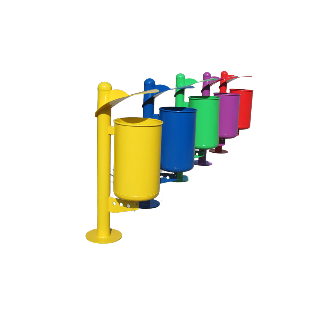 Cestello realizzato in lamiera sagomata d'acciaio zincato sp. 10/10 con fondo e coperchio in disco di lamiera stampato sp. 15/10. Dimensioni cestello cm 30 x 45 h. Palo di sostegno in tubo tondo d'acciaio zincato diametro mm. 80 x 2 con all'apice copritesta semisferico in acciaio. Sistema di svuotamento a ribalta mediante sgancio con chiave a brugola fornita in dotazione. Tettuccio e piastra per ancoraggio al suolo, in lamiera sagomata con tecnologia laser. Ferramenta e bulloneria: in acciaio INOX. Capacita' del cestello: 32 litri ca. Ingombro: cm 30 x 51 x 104 h. Ancoraggio: filo al pavimento.
