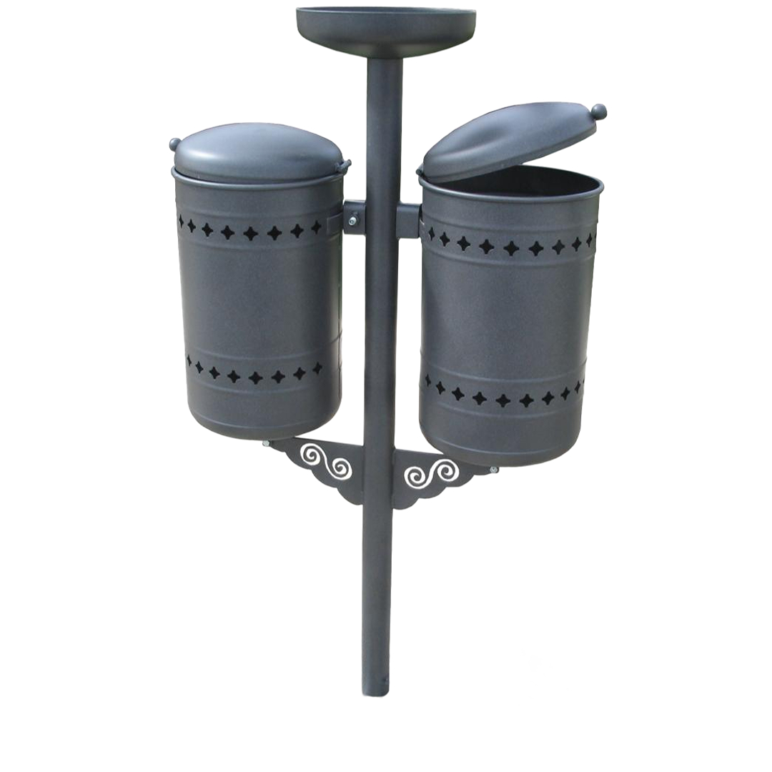 Cestello realizzato in lamiera sagomata d'acciaio zincato con decori disposti su due file dimensioni cm 30 x 51. Fondo e coperchio incernierato del cestello realizzati mediante disco in lamiera stampato. Palo di sostegno realizzato in tubo tondo d'acciaio zincato con all'apice posacenere estraibile. Mensola di sostegno del cestello realizzata in lamiera sagomata con tecnologia laser. Lo svuotamento del posacenere e dei due cestelli avviene mediante sgancio con chiave a brugola fornita in dotazione. Ancoraggio: da interrare per una profondità di cm 20 circa. Ingombro: 30 x 76 x 130 h Capacità Cestello: 36 litri ca. cadauno. Consegnato al cliente in kit di montaggio.