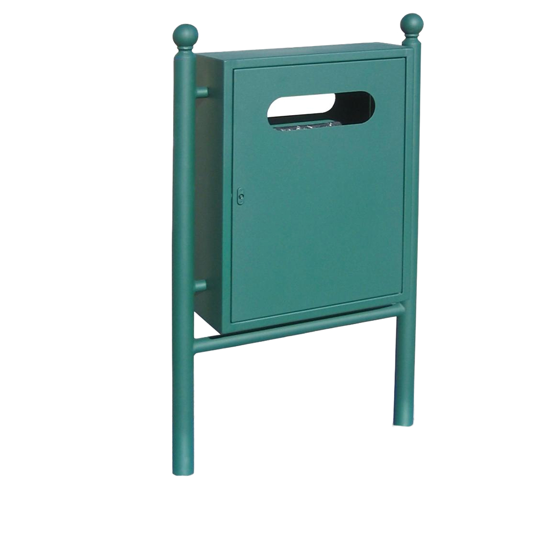 Montanti in tubo tondo d’acciaio zincato con all’apice elemento decorativo a sfera. Contenitore realizzato interamente in lamiera d’acciaio zincato dotato di doppia fessura ovale e di apertura frontale per una facile asportazione dei rifiuti. Munito di fermasacco interno.