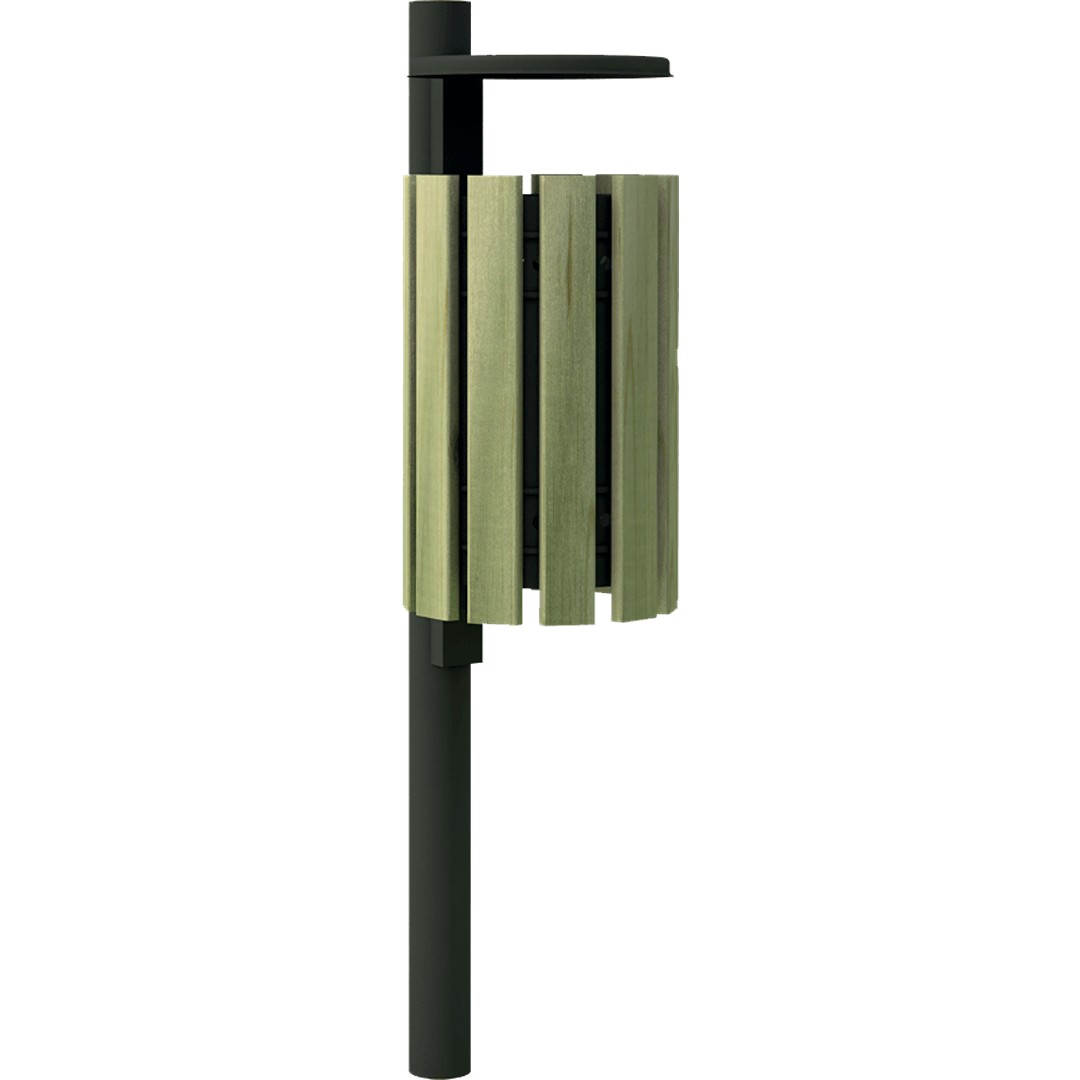 Cestino su palo in acciaio, realizzato con stecche in legno di pino silvestre impregnato in autoclave. Il contenitore interno, anch’esso in acciaio zincato, è rimovibile per lo svuotamento grazie alla apposita chiave in dotazione. Dimensioni 32 x 45 x h 140 cm