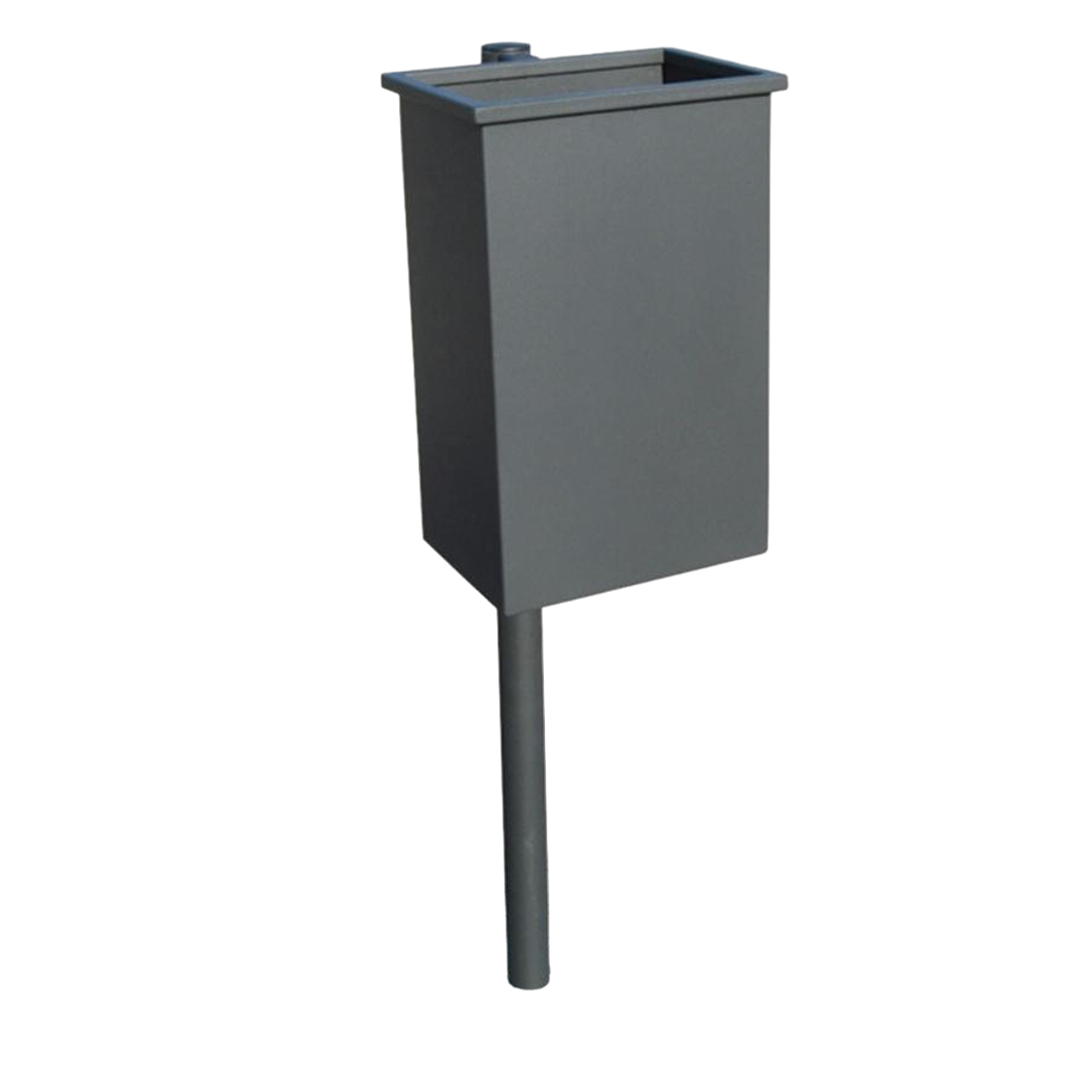 Cestello realizzato interamente in lamiera sagomata d'acciaio zincato dotato di ribordatura superiore. Palo di sostegno realizzato mediante tubo tondo d'acciaio con all'apice copritesta alettato in PE. Sistema di svuotamento mediante sgancio con chiave a brugola fornita in dotazione. Ancoraggio: da interrare. Ingombro: cm 30 x 32 x 120 h. Capacità Cestello: 28 litri ca.