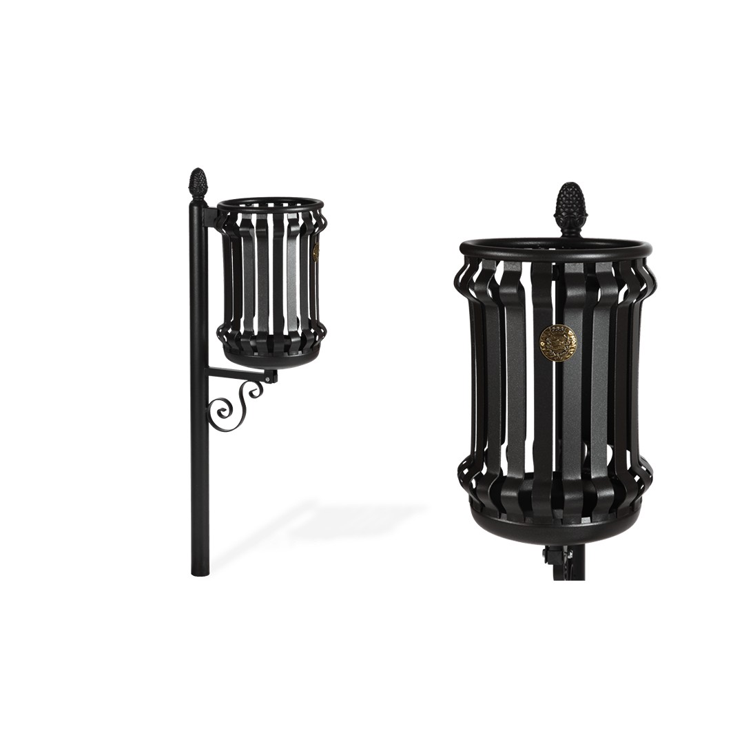 Elegante cestino per centri storici, utilizzato per la raccolta dei rifiuti urbani. Struttura composta da un montante di sostegno in tubo tondo di acciaio zincato adornato sulla parte superiore da un fregio decorativo e sulla parte inferiore da un braccetto di sostegno con ulteriore fregio decorativo in ferro piatto sagomato. Cesto di forma circolare composto da venti listelli in acciaio zincato, sagomati alle due estremità, parte superiore del cesto bordata con tubo tondo, fondo in lamiera di acciaio zincata, sagomata e forata per consentire lo scolo delle acque meteoriche. Le operazioni di svuotamento sono agevolate dall'utilizzo di una vite a brugola che, se rimossa, consente il ribaltamento frontale del cesto. Il fissaggio al terreno avviene mediante il prolungamento del montante di sostegno nel sottosuolo. Il cestino viene fornito in kit di assemblaggio con opportuna viteria in acciaio inox. La finitura base per questo prodotto è del colore “canna fucile” caratterizzato da una cromia grigio scuro dall'effetto metallico. Il cliente può comunque richiedere una finitura differente, a scelta tra i colori RAL a disposizione. Dimensione 35 x 47 x 112 h cm - Peso 15 kg - Capacità 35 lt