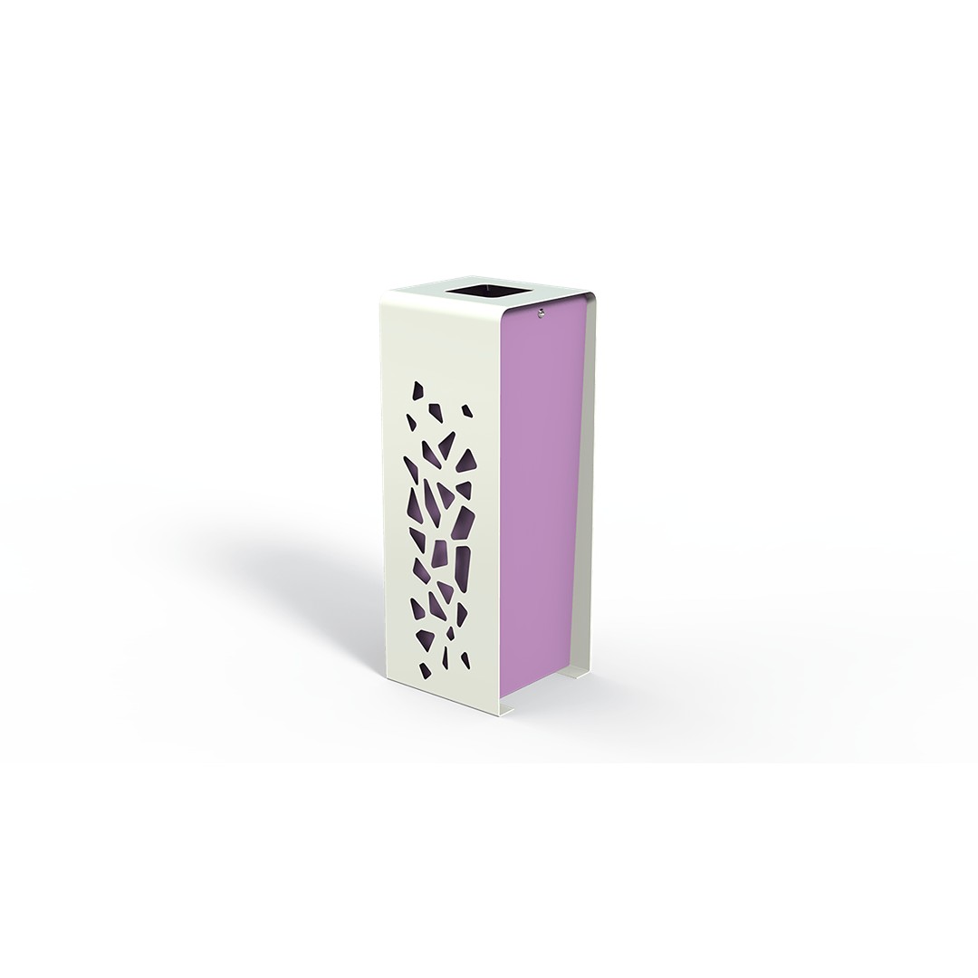 Contenitore per la raccolta dei rifiuti urbani. Struttura di forma lineare con spigoli arrotondati, realizzata in lamiera zincata, la parte laterale è caratterizzata da intagli decorativi stilizzati. Il supporto è dotato nella parte superiore di apertura per l’introduzione dei rifiuti. Anta frontale provvista di serratura a chiave unica, per consentire l’apertura a ribaltamento frontale e l’estrazione del sacco interno. Fondo in lamiera zincata con fori per lo scarico delle acque meteoriche e per il fissaggio al terreno della struttura. Il cestino è provvisto di anello reggi-sacco interno. La finitura base per le parti metalliche di questo prodotto si compone di due colori, nello specifico: colore “bianco puro opaco RAL 9010” per la scocca esterna e colore “lilla bluastro opaco RAL 4005” per anta e pannello posteriore. Il cliente può comunque richiedere una finitura differente, a scelta tra i colori RAL a disposizione. Dimensione 35 x 35 x 93 h cm - Capacità 35 lt