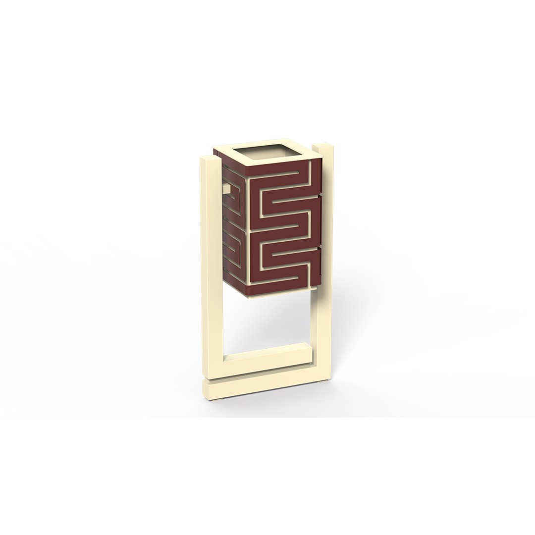 Contenitore per la raccolta dei rifiuti urbani. Struttura di forma squadrata con spigoli arrotondati, realizzata in lamiera zincata, Il cesto è caratterizzato su tutti i lati da un motivo geometrico stilizzato ottenuto con pannelli sagomati a taglio laser. Struttura di sostegno realizzata con profili di acciaio zincato a sezione quadra con particolare effetto estetico. Contenitore con sistema a ribalta per lo svuotamento. La finitura base per le parti metalliche di questo prodotto si compone di due colori, nello specifico: colore “avorio opaco RAL 1015” per il montante e fusto cestino, colore “marrone opaco RAL 8012” per i pannelli decorativi. Il cliente può comunque richiedere una finitura differente, a scelta tra i colori RAL a disposizione. Dimensione 50 x 30 x 90 h cm - Capacità 30 lt