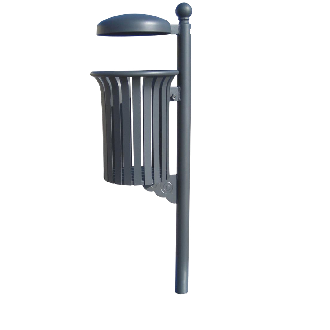 Cestello realizzato con doghe in ferro piatto zincato e "corona" in tubo tondo. Palo di sostegno in tubo tondo d'acciaio zincato con all'apice elemento decorativo in fusione e mensola di sostegno in lamiera sagomata con tecnologia laser. Tettuccio realizzato mediante fondo in lamiera stampata d'acciaio zincato. Sistema di svuotamento mediante sgancio con chiave a brugola fornita in dotazione. Disponibile, su richiesta, aggiunta di cestello interno estraibile dello stesso colore della struttura. Capacita' utile del cestello: 28 litri ca. Ingombro: cm 35 x 41 x 128 h - altezza utile cm 108 ca. Ancoraggio: da interrare.