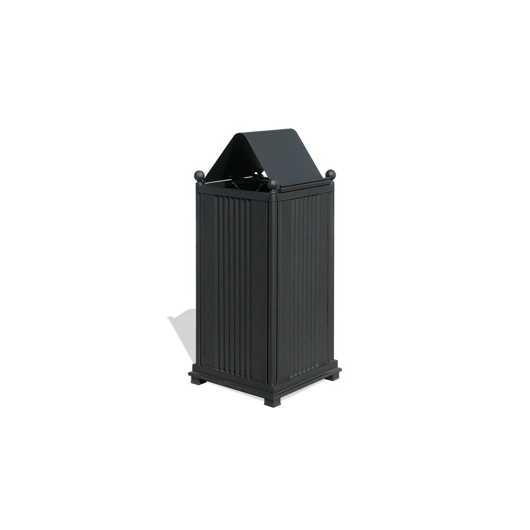 Contenitore realizzato in acciaio zincato per la raccolta dei rifiuti urbano. Struttura composta da un fusto di forma quadra realizzato con quattro colonnine in tubo tondo di acciaio zincato con elemento decorativo alla sommità, le colonnine sono collegate e rese solidali tra loro da traverse in profilato di acciaio zincato ad “L”. Pannellatura perimetrale in lamiera zincata con parte centrale ondulata e bordi pieni alle estremità e anello reggi-sacco, di tipo estraibile, in acciaio zincato con elastico ferma-sacco. Cappello sagomato, di tipo apribile, realizzato in lamiera zincata con un’estremità sagomata per consentire presa e sollevamento; una cerniera collega il cappello al fusto e consente l’apertura per l’estrazione del sacco interno. Il totale ribaltamento accidentale del cappello è impedito da apposita catenella. Anello reggi-sacco, di tipo estraibile, in acciaio zincato con elastico ferma-sacco. Fondo in lamiera di acciaio zincata, forata, per lo scarico delle acque meteoriche in profilato di acciaio zincato ad “L”. La base è provvista di quattro piedini che evitano il contatto diretto della struttura con il terreno e di fori per l’ancoraggio al terreno a mezzo tirafondi e tasselli ad espansione. La finitura base per le parti metalliche di questo prodotto è del colore “canna fucile”.