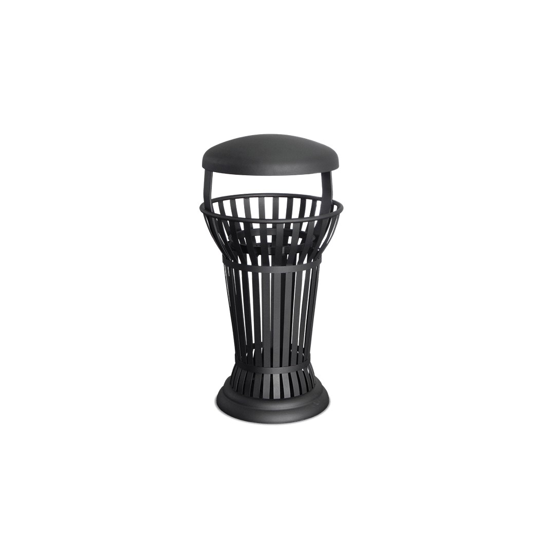 Cestone per la raccolta dei rifiuti urbani. Struttura realizzata da un fusto di forma cilindrica, svasata nella parte superiore con listelli sagomati in ferro piatto zincato e due fasce di collegamento nella parte inferiore e centrale del fusto. Parte superiore bordata da anello in tubo tondo zincato. Coperchio sagomato, di tipo apribile, realizzato in lamiera zincata ed incernierato alla struttura per mezzo di due supporti in lamiera. Anello reggi-sacco (fisso) realizzato in profilato di acciaio zincato. Base sagomata costituita da elemento tornito in lamiera di acciaio zincato spessore. Sistema di svuotamento mediante apertura del coperchio ed estrazione del sacco (non in dotazione). La base è dotata di fori per l’ancoraggio al terreno a mezzo tirafondi e tasselli ad espansione. La finitura base per le parti metalliche di questo prodotto è del colore “canna fucile”. Il cliente può comunque richiedere una finitura differente, a scelta tra i colori RAL a disposizione sul nostro sito web. La tecnica di verniciatura adottata per la struttura in acciaio zincato è a polveri termoindurenti con cottura a forno.