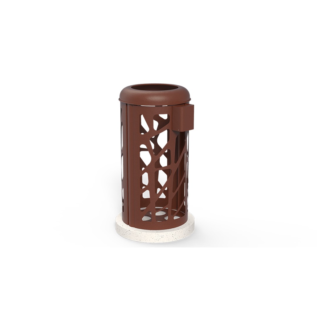 Cestone modello con posacenere. Struttura composta da due profili verticali realizzati in profilati di acciaio zincato collegati al coperchio superiore (di tipo fisso) in lamiera zincata con bordature anti-taglio e foro centrale per l’introduzione dei rifiuti. Fusto cestone realizzato con pannelli in lamiera zincata ed intagli stilizzati ricavati da taglio plasma ad alta definizione. Apertura a libro con cerniere che consentono la rotazione di metà struttura. La sezione apribile è dotata di anello reggi-sacco in acciaio zincato e di chiusura a chiave. Posacenere frontale costituito da unico scatolato in lamiera zincata e completo di lamiera microforata nella parte superiore per lo spegnimento delle sigarette. Fondo di tipo ribaltabile con chiusura a scatto. Base del cestone realizzata in cemento bianco, effetto pietra.