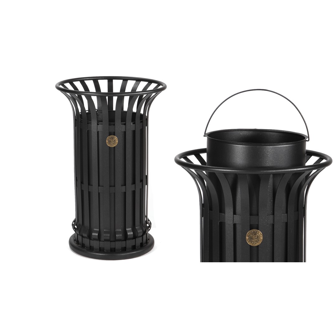 Pattumiera in metallo per la raccolta dei rifiuti urbani. Struttura composta da un fusto di forma cilindrica, svasata nella parte superiore, realizzato con ventuno listelli sagomati in ferro piatto zincato e tre anelli di collegamento nella parte inferiore, centrale e superiore. Parte superiore bordata da anello in tubo tondo zincato e contenitore interno (estraibile) in lamiera zincata completo di maniglia. Base con anello in tubo tondo di acciaio zincato dotata di fori per l’ancoraggio al terreno a mezzo tirafondi e tasselli ad espansione. Svuotamento mediante estrazione del contenitore interno. La finitura base per le parti metalliche di questo prodotto è del colore “canna fucile”.