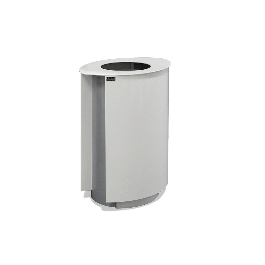 Cestone per la raccolta dei rifiuti urbani. Struttura dalla particolare forma ellissoidale, costituito pannello posteriore ed anta frontale realizzati in lamiera zincata; l’anta (con apertura a libro) è dotata di anello reggi-sacco interno e chiusura a chiave unica. Fusto di forma cilindrica realizzato in profilati di acciaio zincato; al suo interno Il cestone è dotato di piastre per il fissaggio al suolo. Supporto superiore costituito da base sagomata, con foro per l’introduzione dei rifiuti, il tutto realizzato in lamiera zincata. Lo svuotamento del cestone avviene mediante apertura dell’anta frontale ed estrazione del sacco. La finitura base per questo prodotto si compone di due colori, nello specifico “bianco traffico” RAL 9016 per la scocca esterna e l'anello superiore, colore “grigio argento” RAL 7001 per le fasce laterali.