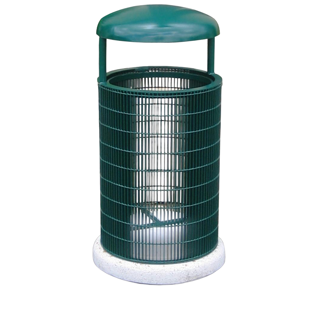 Cestone realizzato in grigliato con maglia sezione mm. 15 x 76. Base circolare in calcestruzzo sabbiato. Tettuccio realizzato con disco in lamiera stampato. Cestone munito di anello fermasacco interno d'acciaio zincato e sistema di apertura frontale per una facile asportazione dei rifiuti. Capacità Cestone: 120 litri ca. Ingombro: cm 50 x 50 x 105 h. Ancoraggio: filo al terreno.