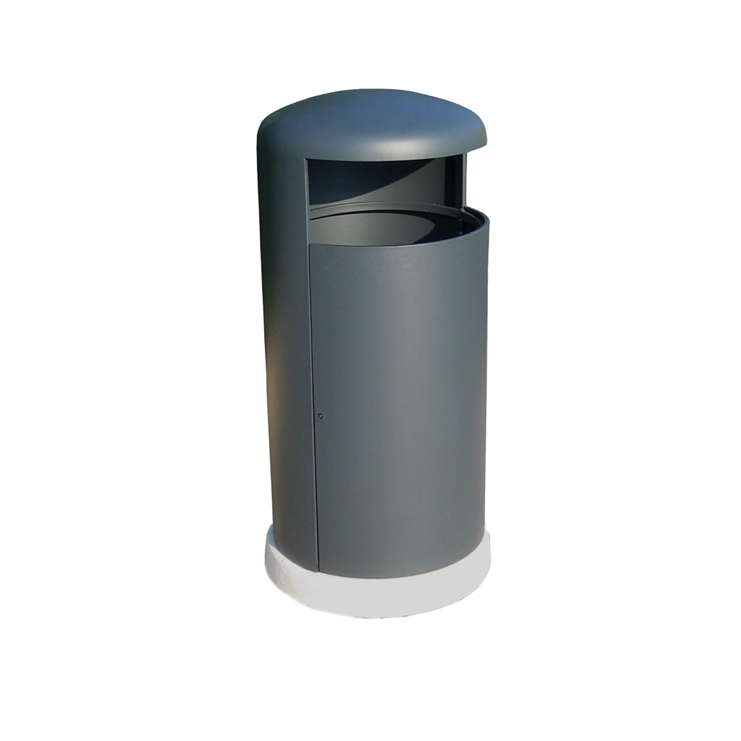 Cestone realizzato interamente in lamiera d'acciaio zincato. Provvisto di cerniera per l'apertura frontale per una facile asportazione dei rifiuti. Base in calcestruzzo bianco sabbiato. Tettuccio realizzato con disco in lamiera stampato. Dotato internamente di anello fermasacco. Capacita' Cestone: 120 litri ca. Ingombro: cm 50 x 50 x 98 h. Ancoraggio: filo al terreno.