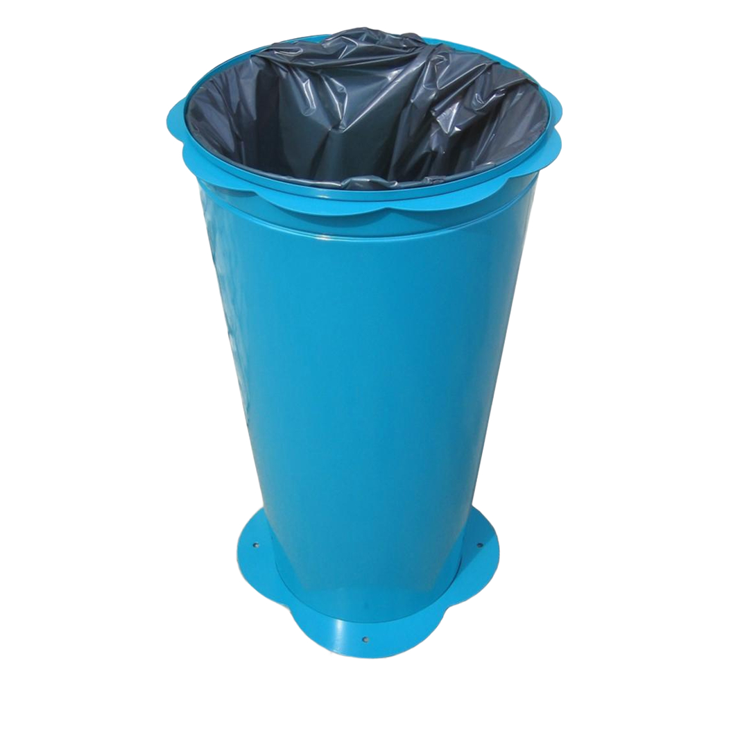Cestone dalla forma tronco-conica realizzato in lamiera d'acciaio zincato. Provvisto di fregi in lamiera sagomata con tecnologia laser. Dotato internamente di anello fermasacco. Diametro superiore cm 50 / inferiore cm 35 (esclusi fregi). Capacita' Cestone: 110 litri ca. Ingombro: cm 60 x 60 x 80 h. Ancoraggio: filo al terreno.