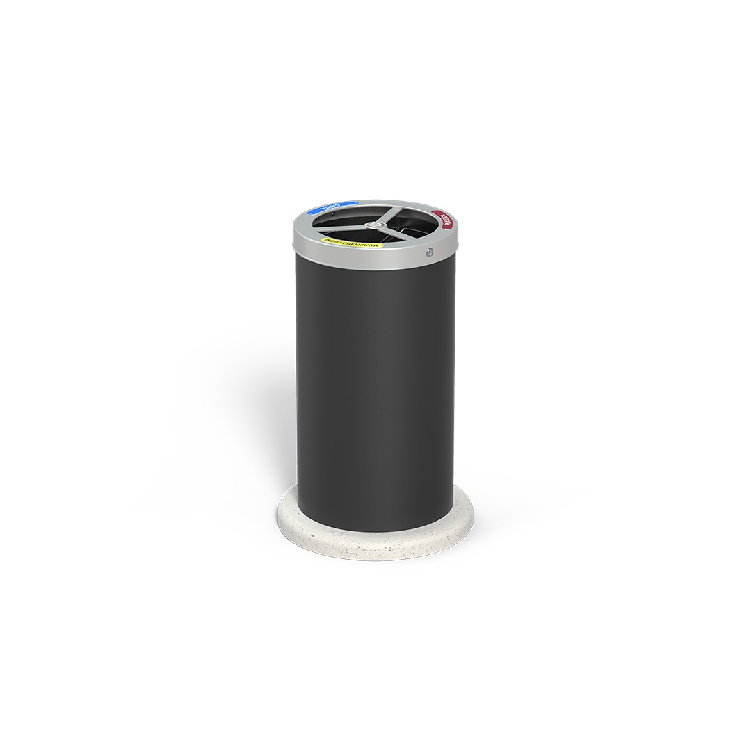Cestone per la raccolta dei rifiuti differenziati,con base in CLS. La struttura è di forma cilindrica, realizzata in lamiera di acciaio zincata, suddivisa al suo interno in tre scomparti indipendenti. La parte superiore è completata da un anello, ribaltabile, realizzato in angolare di acciaio zincato con bordatura interna anti taglio e bordatura esterna decorativa. L’anello è suddiviso in tre settori ciascuno dei quali è contraddistinto da una targhetta sagomata, anch'essa in lamiera, con intagliato il testo della tipologia di rifiuto che può ospitare e verniciata con un colore appropriato a facilitarne il rilevamento. La base del contenitore è realizzata in cemento bianco effetto pietra. Lo svuotamento del cesto è previsto mediante apertura dell'anello superiore, apertura reggi-sacco ed estrazione del sacco.