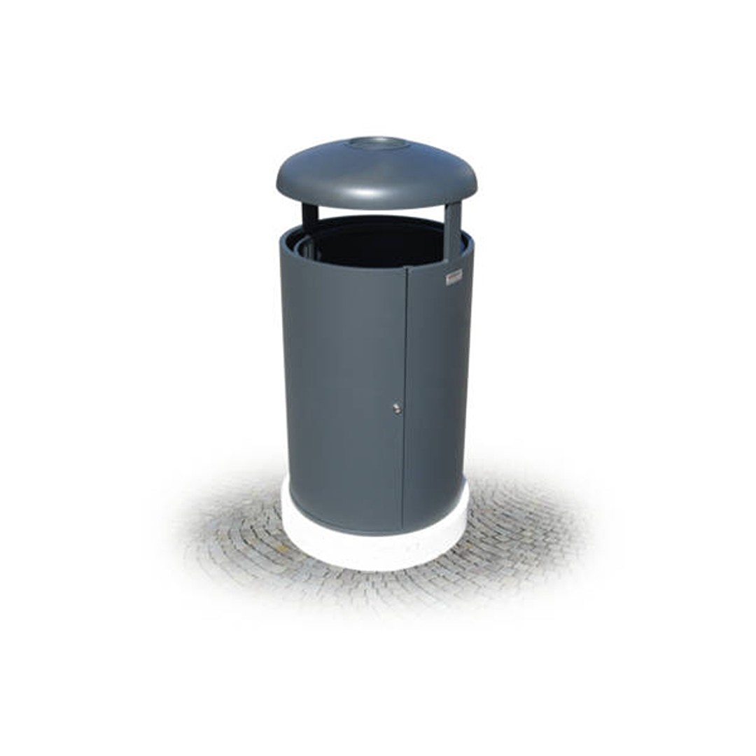 Base in calcestruzzo bianco sabbiato. Tettuccio realizzato con disco in lamiera stampato. Dotato internamente di anello fermasacco.