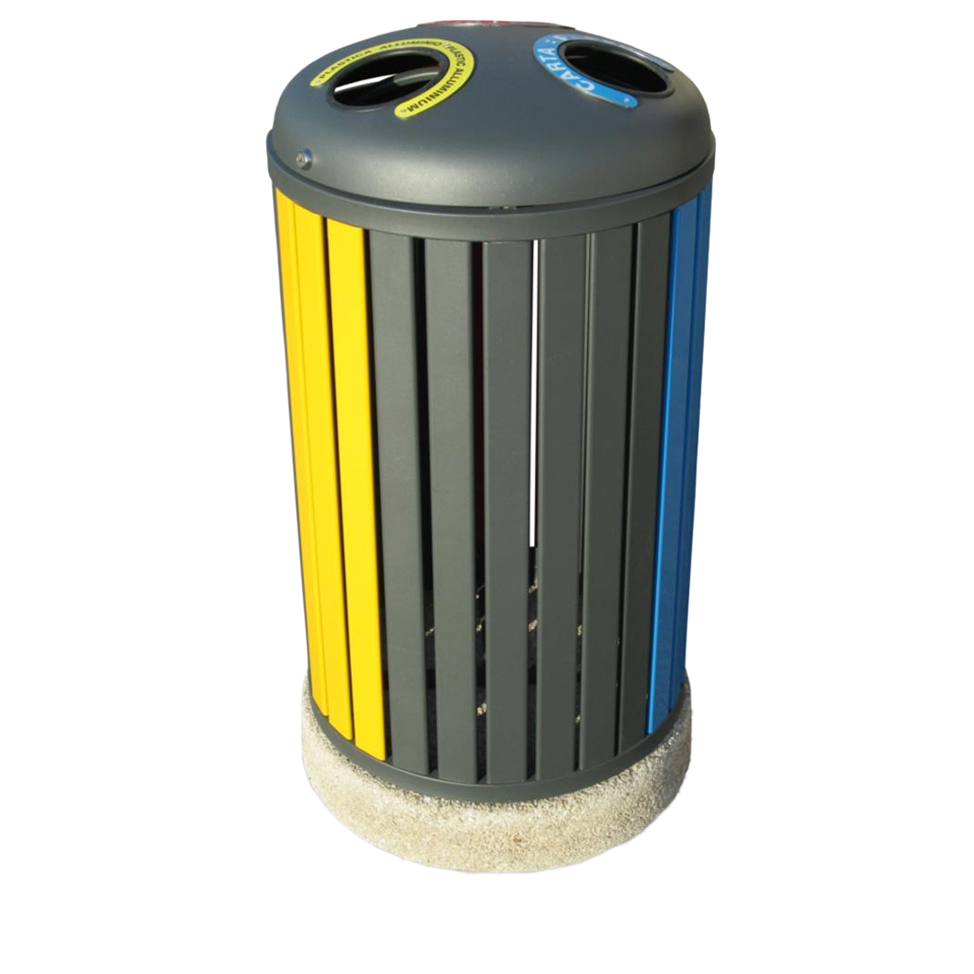 Cestone costituito da telaio realizzato mediante doghe in tubolare d'acciaio zincato dotato di coperchio apribile mediante serratura con chiave fornita in dotazione. Coperchio provvisto di n. 3 bocche per l'inserimento dei rifiuti in funzione della tipologia che lo stesso puo' contenere indicato da appositi adesivi circolari. Basetta in cls bianco tipo travertino armato, vibrato e trattato antidegrado. Cestone dotato al suo interno di appositi fermasacco. Ancoraggio: filo al terreno. Ingombro: cm 50 x 50 x 90 h. Capacita' Cestone: 120 litri ca.