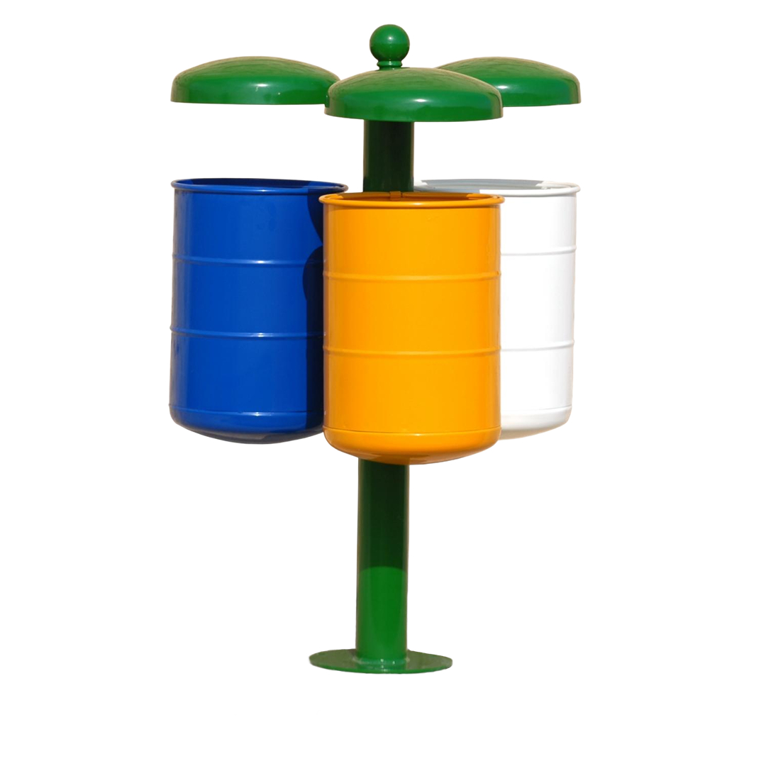 Cestelli realizzati in lamiera d'acciaio zincato sp. 10/10 dimensioni cm 30 x 45 h dotati di fondo bombato in lamiera d'acciaio zincato sp. 15/10. Sostegno centrale, munito di piastra tonda per l'ancoraggio al suolo, realizzato in tubo tondo d'acciaio zincato mm 90 con elemento decorativo a sfera posto all'estremità superiore. Tettucci bombati in lamiera d'acciaio zincato sp. 30/10. Sistema di svuotamento mediante sgancio con chiave a brugola fornita in dotazione. Capacità del cestello: 32 litri ca. cadauno. Ingombro: cm 75 x 75 x 109 h. Ancoraggio: filo al terreno.