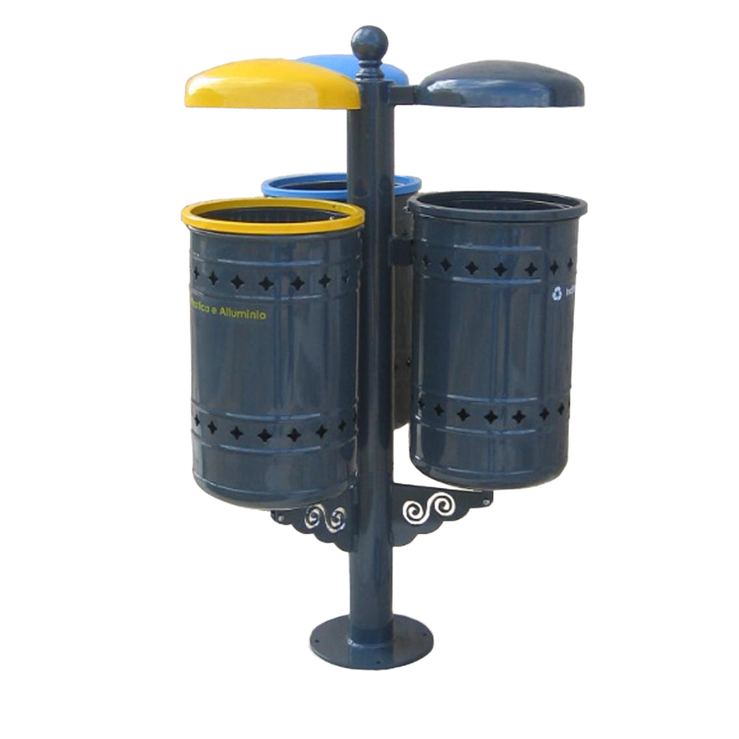 Palo di sostegno in tubo tondo con all'apice elemento decorativo a sfera realizzato in ferro forgiato a caldo. Cestelli realizzati in lamiera d'acciaio dotati di mensola di sostegno in lamiera sagomata con tecnologia laser e fondo realizzato mediante disco di lamiera stampato. Tettucci in lamiera stampata colorati in base alle tipologie di rifiuto che lo stesso cestello puo' contenere. Cestelli dotati di sistema di svuotamento mediante sgancio con chiave a brugola fornita in dotazione. Completano la struttura n. 3 anelli fermasacco esterni dotati di sistema a cerniera colorati come i corrispondenti tettucci. Capacita' del cestello: 36 litri ca. cadauno. Ingombro: cm 69 x 69 x 109 h. Ancoraggio: filo al terreno.