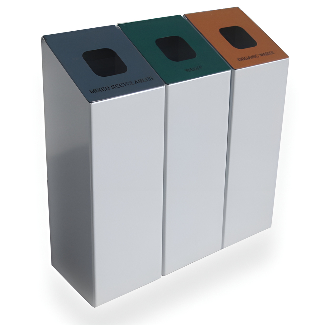 Formato da 3 cestini dalla capacità di 60 litri ciascuno. Il kit è dotato di reggi sacco interno e coperchio superiore per introduzione/svuotamento dei rifiuti in lamiera di acciaio sagomato.