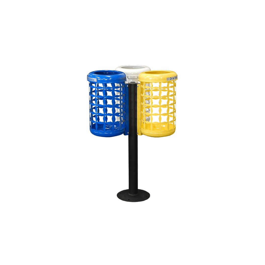 Cestino per la raccolta dei rifiuti differenziati. Struttura composta da un montante di sostegno in tubo tondo di acciaio zincato completo di terminale in PVC; alla base il montante è dotato di piastre circolare in lamiera zincata provvista di fori per il fissaggio al suolo. Tre cesti di forma cilindrica realizzati in lamiera zincata con particolari intagli stilizzati di ampie dimensioni, che permettono la visibilità nel contenuto interno (contenitore tipo anti-terrorismo). Ogni cesto è dotato nella parte superiore di coperchio reggi-sacco, di tipo apribile, realizzato in lamiera zincata con bordatura anti-taglio e provvisto di foro centrale per l’introduzione dei rifiuti. Ogni coperchio è dotato di targhetta indicante la tipologia di raccolta. La finitura base per le parti metalliche di questo prodotto è composta da diversi colori, nello specifico: colore “canna fucile” per il montante di sostegno, colore “bianco traffico” RAL 9016 per cesto e anello destinato alla raccolta della carta, colore “giallo zinco” RAL 1018 per cesto e anello destinato alla raccolta della plastica, colore “blu traffico” RAL 5017 per cesto e anello destinato alla raccolta dell’alluminio. Il cliente può comunque richiedere una finitura differente, a scelta tra i colori RAL a disposizione. Dimensione 74 x 68 x 113 h cm - Capacità 100 lt