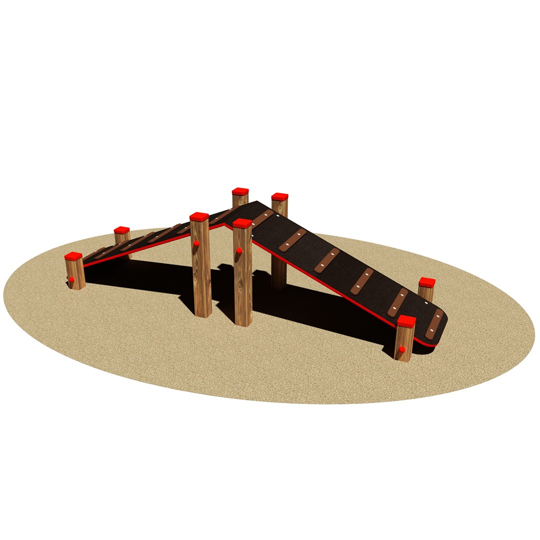 Realizzato in legno di pino nordico impregnato in autoclave con sali atossici. Costituita da n° 2 pedane inclinate in multistrato di betulla ad incollaggio fenolico, con zigrinatura antiscivolo, e rifinitura con film colorati in entrambi i lati, sorrette da n° 4 montanti in legno di pino lamellare della sez. cm 7 x 7. Assemblaggio mediante bulloneria in acciaio zincato 8.8 e dadi autobloccanti. Elementi copridado a norma in nylon colorato. Tappi copripalo in polietilene. Ingombro: cm 275x68x70h