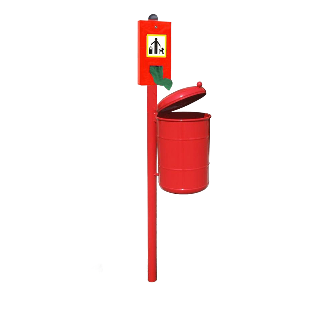 Cestino per raccolta deiezioni canine, costituito da un contenitore e palo di sostegno in acciaio zincato. Il contenitore è dotato di coperchio per garantire protezione dagli agenti atmosferici.