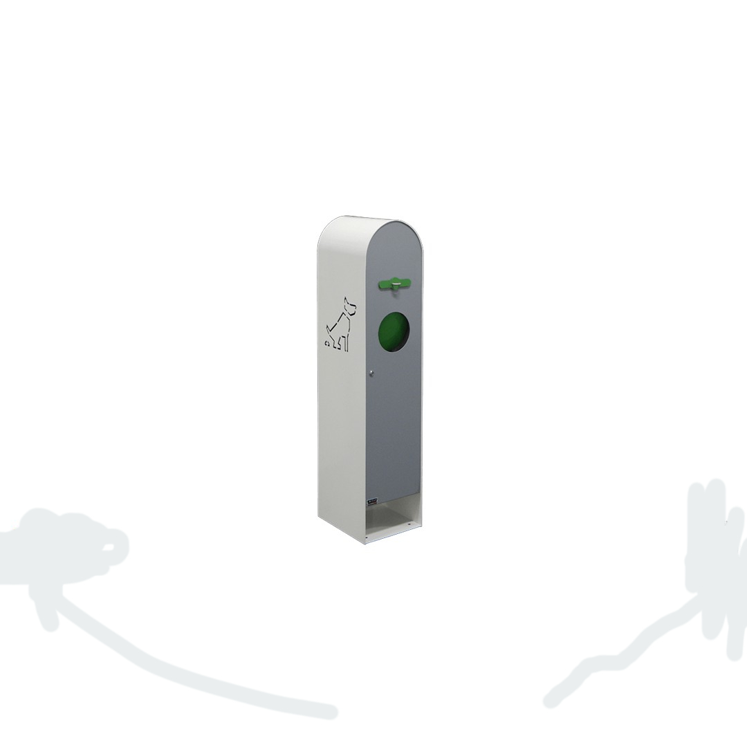 Contenitore ad uso urbano per le deiezioni canine. Struttura composta da scocca esterna sagomata in lamiera zincata, caratterizzata da intaglio a forma di cane stilizzato su entrambe i lati, le sagome sono ricavate da taglio con tecnologia plasma ad alta definizione. Anta frontale realizzata in lamiera di acciaio zincato dotata di foro per l’introduzione dei rifiuti, il foro è completo di sportello per evitare l’eventuale uscita di cattivi odori. Nella parte superiore dell’anta vi è un cassetto per il kit di raccolta, la semplice estrazione del cassetto permette al kit di fuoriuscire per essere utilizzato dall’utente. L’anta è dotata di serratura a chiave universale per consentire all’apertura le fasi di svuotamento del contenitore interno e la ricarica dei kit di raccolta. Tamponamento posteriore realizzato in lamiera di acciaio zincato. La struttura è dotata alla base di fori per il fissaggio al suolo. La finitura base per questo prodotto si compone di tre colori, nello specifico “verde maggio” RAL 6017 per lo sportello ed il cassetto, colore “bianco traffico” RAL 9016 per la scocca esterna e colore "grigio argento " RAL 7001 per l'anta ed il pannello. Il cliente può comunque richiedere una finitura differente, a scelta tra i colori RAL a disposizione. Dimensione 27 x 35 x 130 h cm - Capacità 23 lt