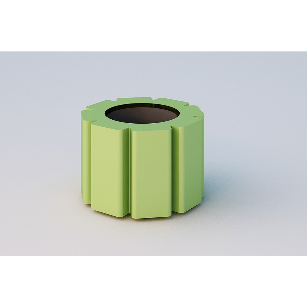 Fioriera alta in metallo dalla forma circolare per arredo urbano. La finitura base per le parti metalliche di questo prodotto è il colore “verde biancastro opaco RAL 6019”.