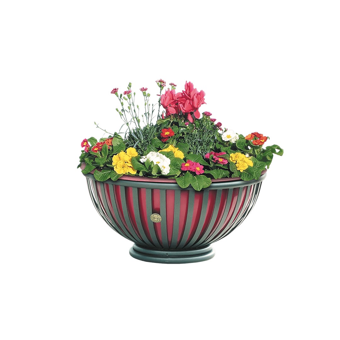 Elegante fioriera circolare con vasca in vetroresina. Struttura di forma circolare composta da doppio anello di base ed anello superiore in tubo tondo di acciaio zincato e quaranta elementi curvi in ferro piatto zincato. Contenitore interno realizzato in vetroresina colore “rosso mattone”. La finitura base per le parti metalliche di questo prodotto è il colore “canna fucile” caratterizzato da una cromia grigio scura dall'effetto metallico.